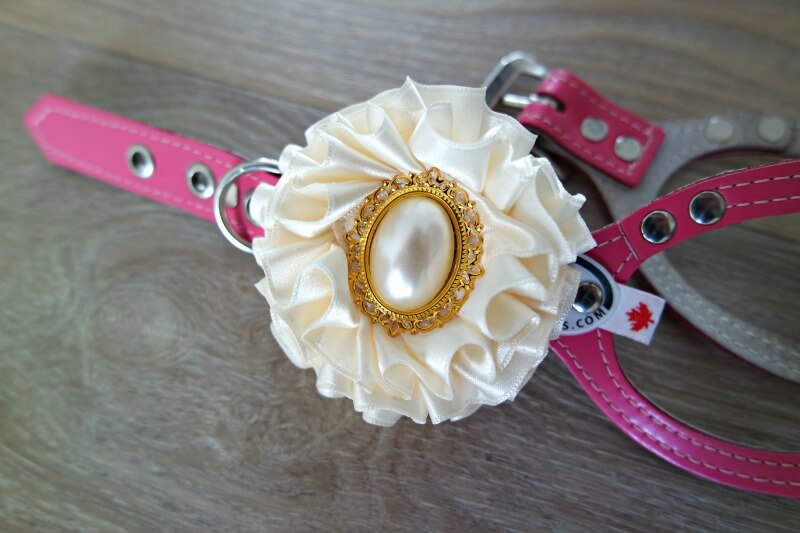 Ik wil beginnen met deze prachtige slider! Wauw wauw wauw wauw…. Ik had de buddy belt al een aantal jaar.Een buddy belt verminderd de druk op de nek van het hondje. Ik gebruik zowel halsbanden als tuigjes, ook wel afhankelijk van mijn bui en de periode. Ik vind het zelf fijner met een tuigje omdat ik dan, als ik een ruk aan het lijntje geef, zeker weet dat ik haar nekje niet beschadig. Ze past deze gelukkig nog en hij blijft er mooi uit zien. Nu had ik op de chihuahua facebook pagina gezien dat iemand hele mooie strikken en rozetten gemaakt had voor aan een buddy belt. Deze dingen worden ook wel buddy belt sliders genoemd. Ik heb deze mevrouw toegevoegd en een paar dagen later gingen er weer een aantal sliders in de verkoop! Wil je er een bemachtigen dan moet je snel zijn want ze zijn altijd zo weer op! Ik zat klaar achter de computer en hoppa het lukte me gelukkig om deze roset te bemachtigen. Ik kocht deze voor € 10,00 incl. verzendkosten. Vind het echt een mooie uitbreiding op mijn buddy belt!