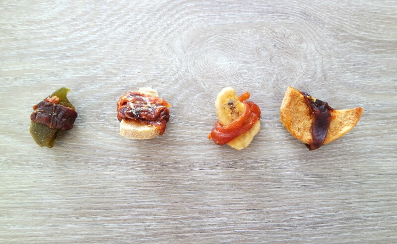Op het boodschappenlijstje wat mijn vriend had gemaakt stonden snoepjes voor Zoë, zo schattig hihi. Toen ik na een gezellige persdag bij Marcipano (bericht komt volgende week online!) nog even langs het plaatselijke tuincentrum ging om mijn prijs (ja ik had een TomTato gewonnen) op te halen zag ik deze snoepjes liggen. Het zijn Zoë’s lievelingssnoepjes dus nam ik deze mee! Ze is dol op fruit en groente. Deze snoepjes zijn gedroogd fruit omwikkeld met een beetje vlees. Van links naar rechts: kiwi, ananas, banaan en appel. Ik had ze allemaal op een rijtje gelegd om te kijken welke ze als eerst zou pakken. Ze pakte gelijk de kiwi dus ik ga er vanuit dat ze die het lekkerst vindt. Net als met mensen kan dat per dag ook wel weer verschillen hoor hihi 😉 .