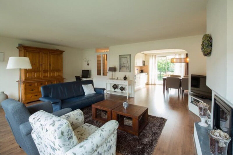 Wij hebben de keuken er uit gehaald, de vloeren, de mega schouw en de lelijke boog die de kamer vooral een stuk kleiner deed lijken. Er lagen twee vloeren over elkaar heen dus dat was eerst al een hele klus. We hebben alle muren laten stucen aangezien het spachtelputz van de muren af kwam zetten. Er is een nieuwe houten vloer in gegaan over de gehele verdieping en de keuken is verplaatst van de voorkant van het huis naar de achterkant. Daar hebben wij een hele nieuwe keuken geplaatst met een betonnen aanrechtblad. Als raamdecoratie zijn wij gegaan voor shutters aan de achterkant en gewoon gordijnen aan de voorkant. De shutters hadden wij gezien in een huis waar wij eerder waren gaan kijken (die uiteindelijk voor onze neus verkocht werd) en we vonden dat allebei gelijk erg mooi. Het is ook erg praktisch en geeft je huis een warm gevoel. Hieronder twee foto’s van hoe het na de verbouwing was.
